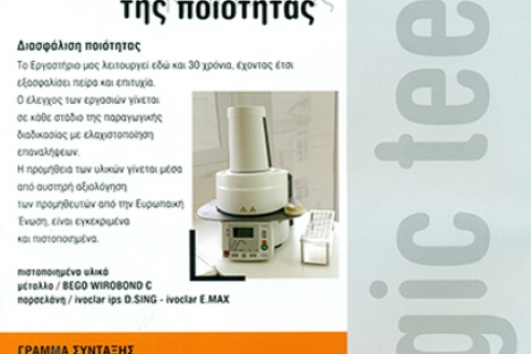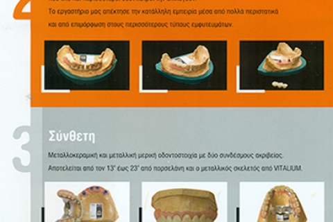 Ένα όμορφο χαμόγελο που θα δημιουργεί αυτοπεποίθηση στον κάθε ασθενή. Τα υλικά που χρησιμοποιούμε είναι τα πιο σύγχρονα και οι υπηρεσίες που προσφέρουμε είναι: οδοντοστοιχίες, μεταλλοακρυλλικές γέφυρες, στεφάνες, πορσελάνη, ορθοδοντικές εργασίες. Όλα βέβαια με τους κανόνες υγιεινής.